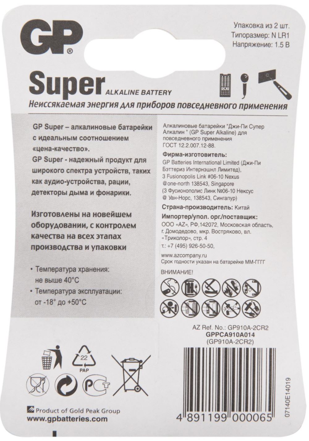 Описание алкалиновых батарей GP Супер Alkaline 910A типоразмера N (Блистер, 2 шт):