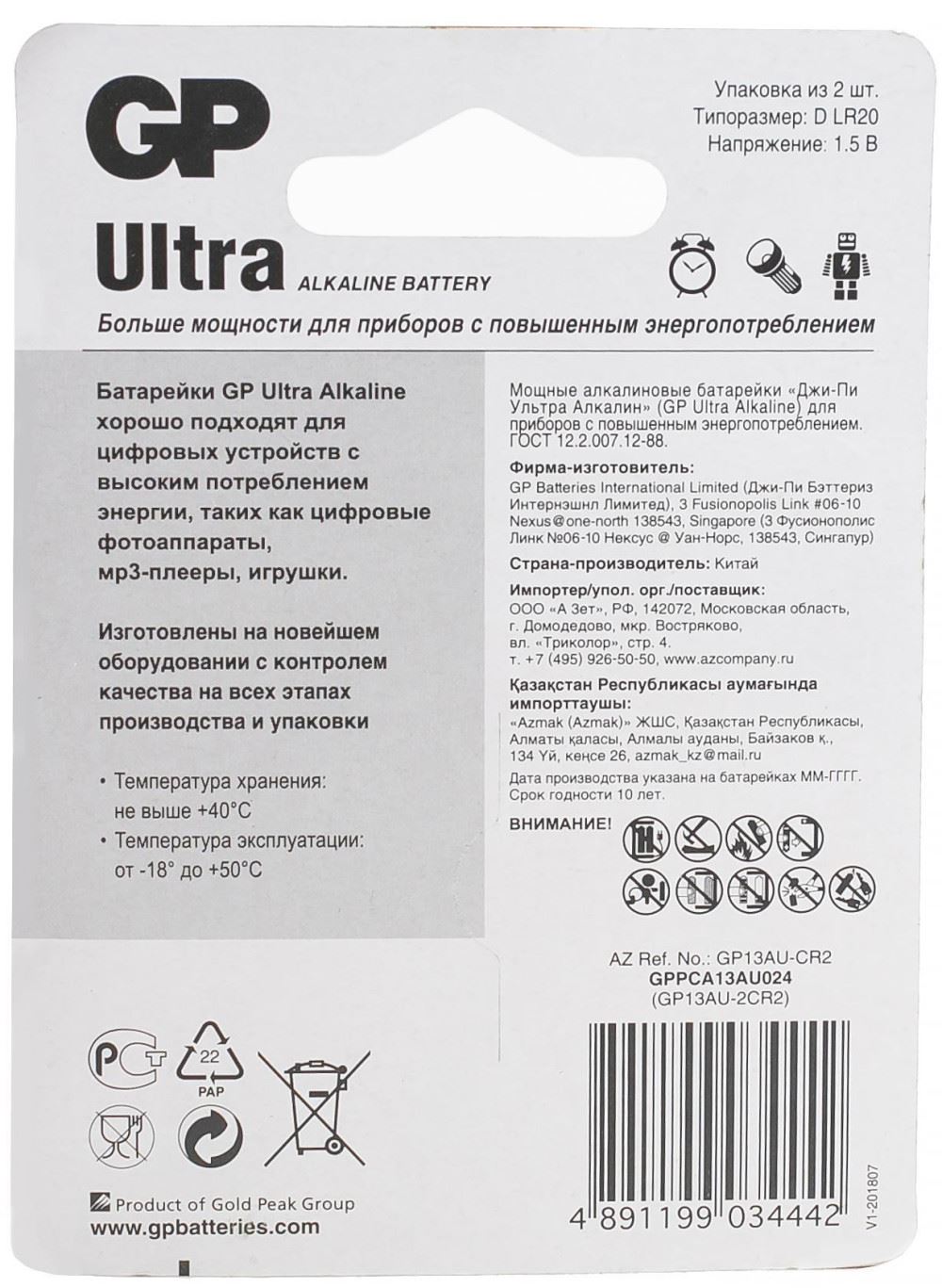 Описание алкалиновых батарей GP Ultra Alkaline 13А типоразмера D (Блистер, 2 шт):