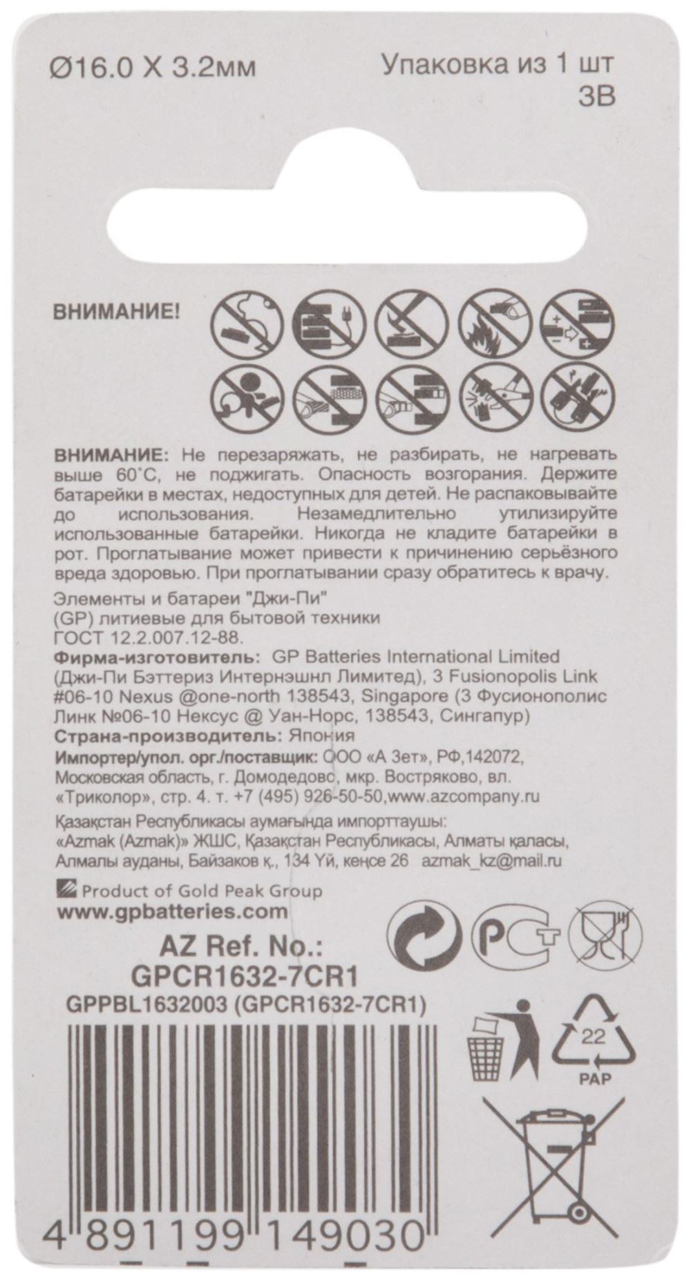 Возбраняется деформировать, разбирать, кидать в огонь либо стараться подзаряжать GP Lithium CR1632-7CR1. Не храните батареи в холодильнике, рядом с железными предметами, к примеру, ключами либо слесарными инструментами, также около источников открытого огня.