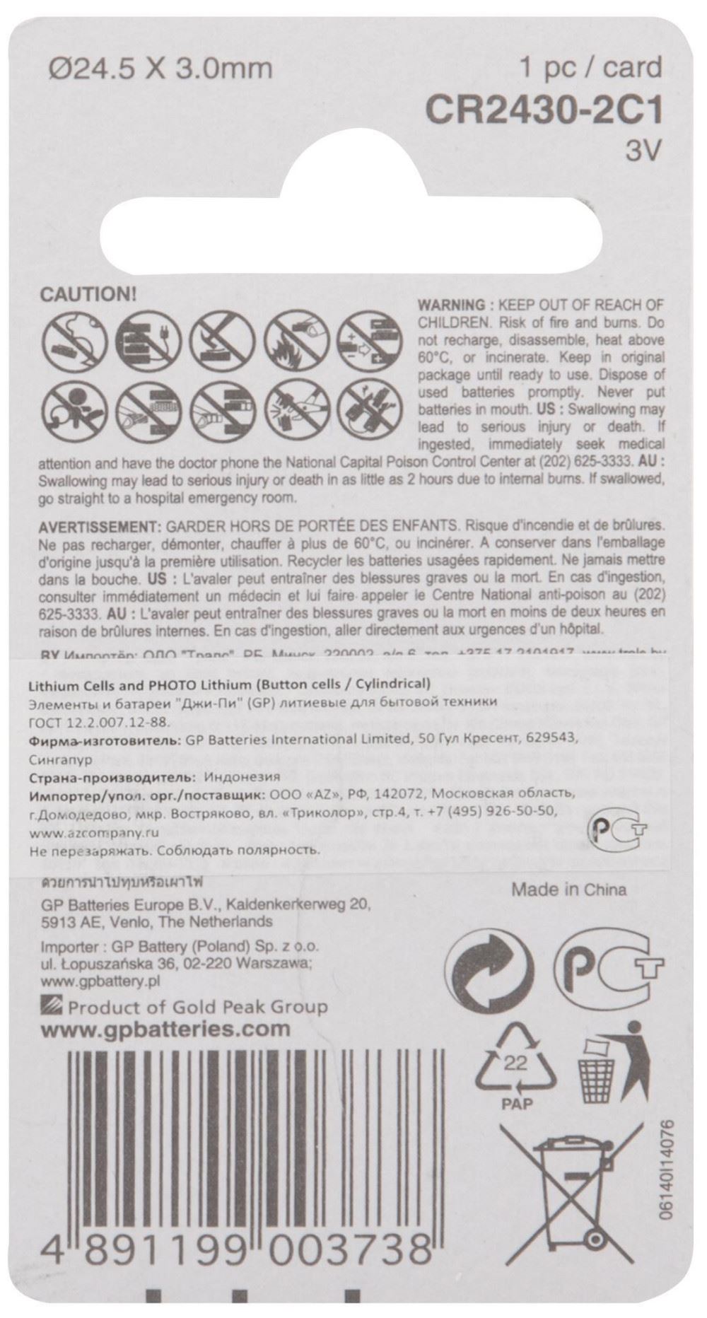 GP CR2430-CR1 сделаны на базе марганцево-литиевой электрохимической системы, о чем свидетельствует маркировка CR в названии продукции. Они соответствуют интернациональным и российским условиям безопасности.