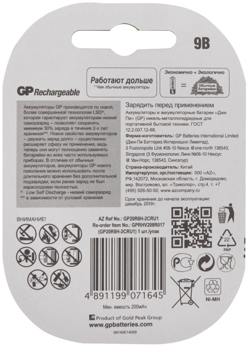 Описание перезаряжаемых батарей GP 20R8H 9V Крона, ескость 200 мАч (Блистер, 1 шт):